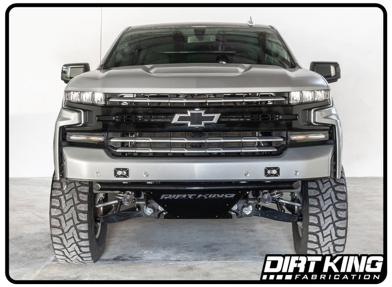 The Dirt King prerunner bumper is a perfect addition to any off road Silverado 1500. It gives the front end that finishing touch as well as providing a strong structure to withstand the punishment seen off roading. The bumper is CAD designed and constructed with DOM tubing. We offer several options allowing you to customize it to your preferences. The standard bumper comes raw metal with an aluminum Dirt King skid plate. This bumper bolts into the factory holes on the frame and requires the factory bumper to be trimmed.